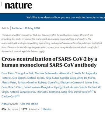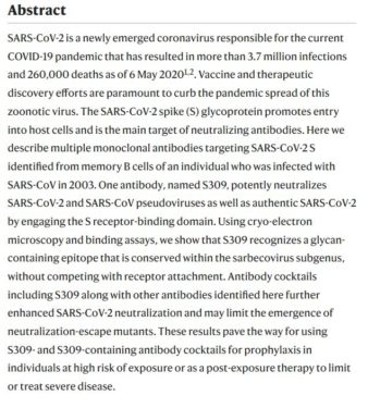 2013年のSARSウイルスの抗体が、同型の新型コロナウイルスにも効果がありそうです。