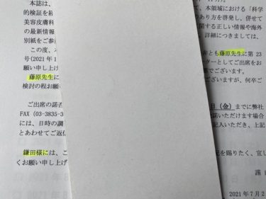 某医学雑誌からクリニックF「藤本幸弘」宛に原稿依頼が来たのですが、途中から「藤原先生」に表記が変わり、最後はなんと「鎌田様」に…。