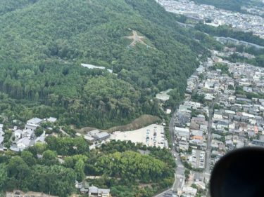 ヘリより見た京都五山送り火、大文字焼き。大文字二つ、妙、法、そして舟。
