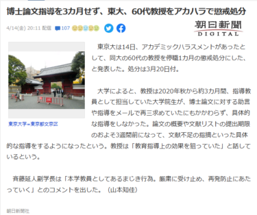 朝日新聞『博士論文指導を3カ月せず、東大、60代教授をアカハラで懲戒処分』
