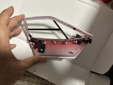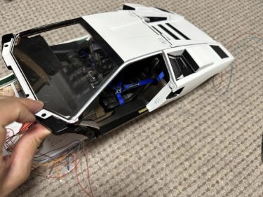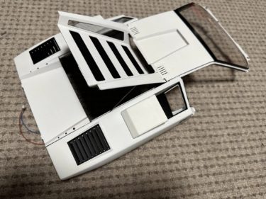 ヘッドライトをピラーに設置し、さらに左右のシザードアを作成中。