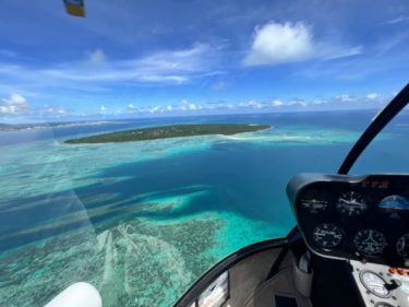 ヘリコプターを利用した海上災害対策の仕事の視察のため、石垣島のサンゴヘリポートより飛び立ち、竹富島と幻の島へ。