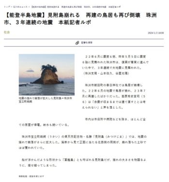 【能登半島地震】見附島崩れる 再建の鳥居も再び倒壊 珠洲市、3年連続の地震 本紙記者ルポ|社会|石川のニュース|北國新聞 (hokkoku.co.jp)