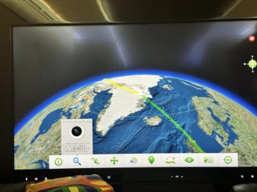 ロシア上空を通過出来ないので北極圏を飛び、グリーンランドを通過して14時間弱でロンドンへ。