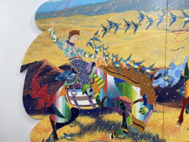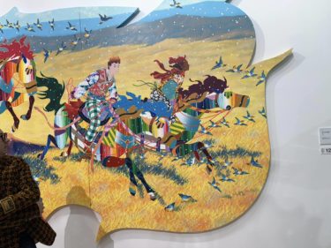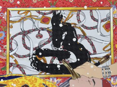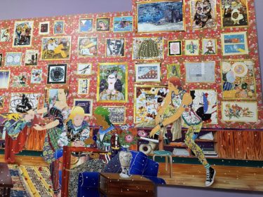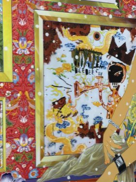 バスキアや草間彌生、葛飾北斎、棟方志功などの絵画の模写が絵の背景に組み込まれています。