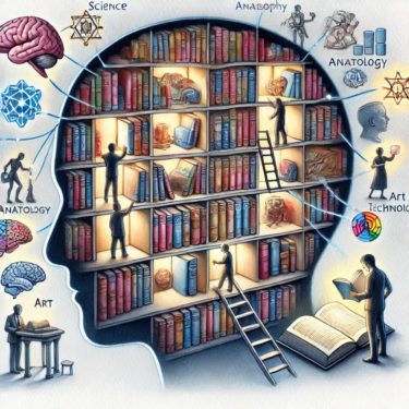 脳の中が知の図書館のように描かれ、各棚には「論理」「解剖学」「データ分析」などの知識が光る書物として整理されています。知識が分野横断的に繋がるような光の糸も描かれています。本当に便利な世の中になりましたね。