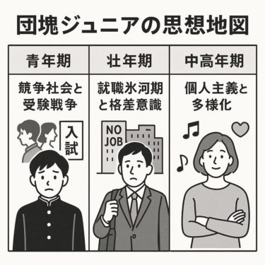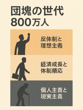 つまり、団塊の世代の思想は「戦後民主主義の申し子」として出発し、やがて経済成長の担い手となり、今はシニア層として個人主義的に生きる──という三段階の変遷を経てきたといえます。