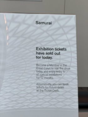 大英博物館サムライ人気を舐めてました。やってきたところ本日のチケットは完売だそうです。ただし、サムライ専用の大きなお土産屋さんもあり、詳しいガイドブックも売っていましたので、何が展示されていたかはわかりました。