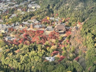 Although the altitude is a bit different, these are views of Kiyomizu-dera during cherry blossom season and autumn foliage, photographed from a helicopter. When seen from above, the beauty of the autumn leaves is truly breathtaking.